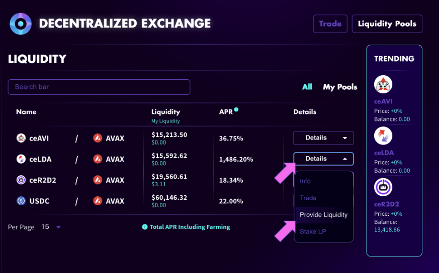 2- To provide liquidity, users can select a pool from the list and click on "Details", then on "Provide Liquidity". Alternatively, they can click directly on the pool.